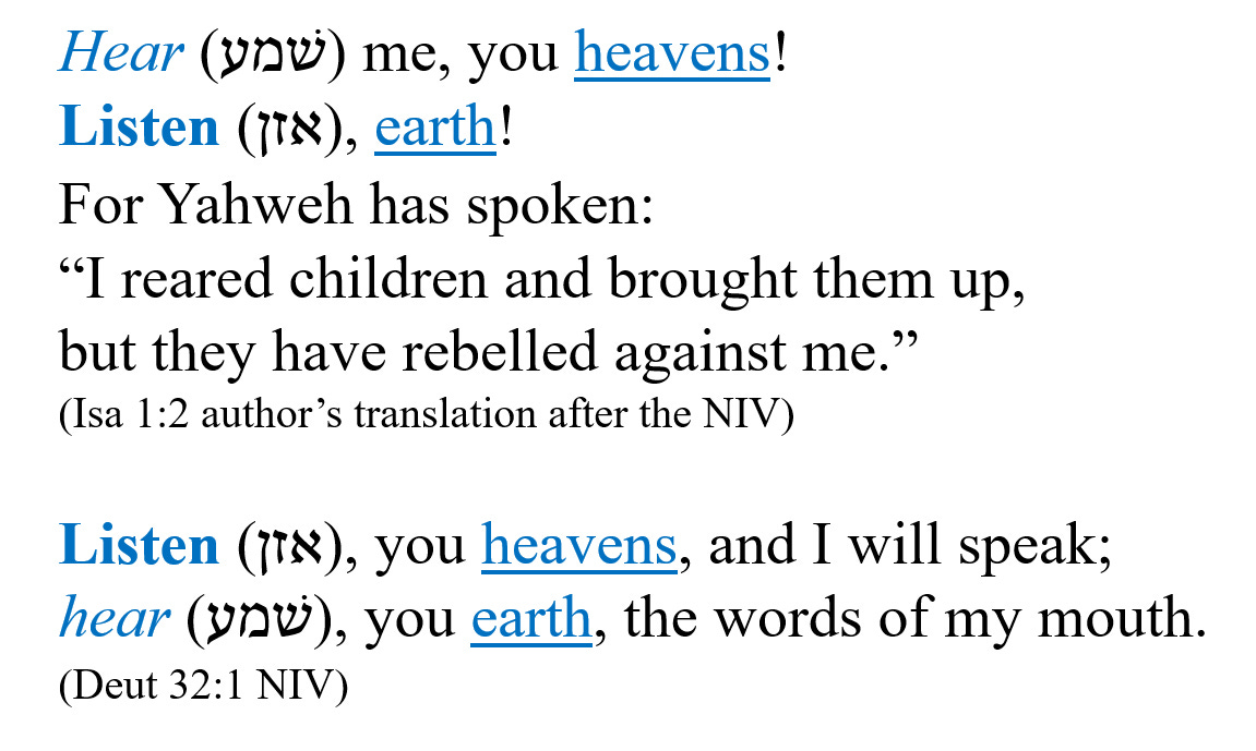 Consider the likely trace. A trace is an unquoted passage that gives rise to the biblical author’s interpretation. We always need to be careful with traces because of the absence of explicit evidence. Moses may have in mind witnesses for the covenant agreement. The trace is Isaiah’s seeing the heavens and the earth as the two or three witnesses needed in the capital case against Yahweh’s own son Israel (cf. Deut 21:15‒17). “Upon the testimony of two witnesses or three witnesses shall a person surely be put to death” (author’s translation). Look again at Isaiah 1:2 above and see what you think.